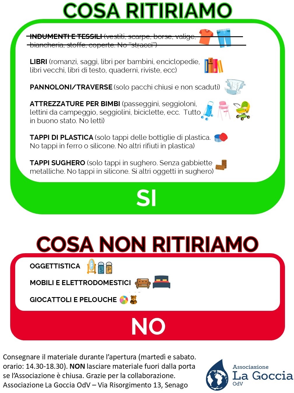 Ogni martedì e ogni sabato La Goccia apre al pubblico. Il materiale, che è stato donato da privati o aziende e rigenerato dai volontari dell'Associazione, viene esposto per ricevere una nuova vita.